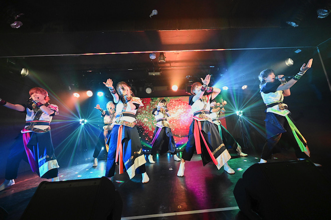 マスク着用に手指のアルコール除菌、ソーシャルディスタンスを保ちながら、カラフルなペンライトを手にした“戦乙女【おとめ】”たち。場内お祝いモード一色に染まる中、客電が消えるとステージ背面の液晶モニターに現7人でのライブ映像が流れ出す。これから始まるステージへの期待感と高揚感が最高潮に高まったところで、黄色い歓声を浴びながらメンバーが登場。待ちに待った戦国GEKOKUJOの<戦国三周年祭>が華やかに幕を開けた。