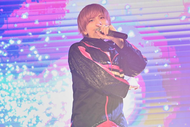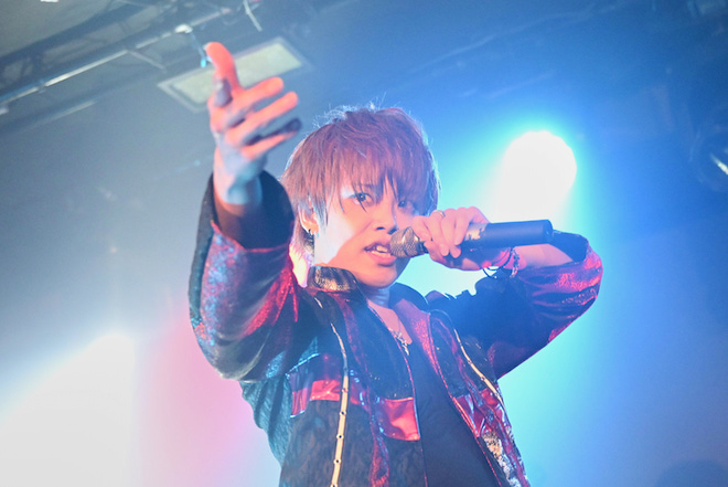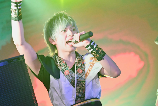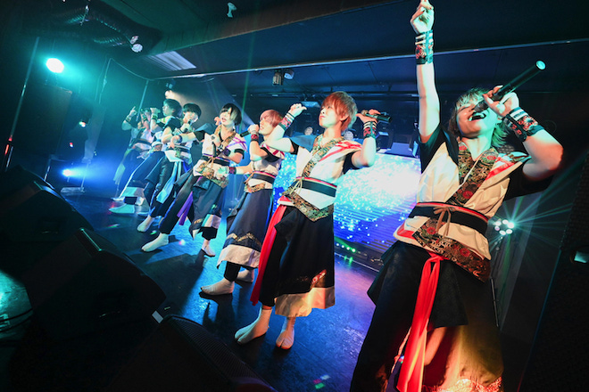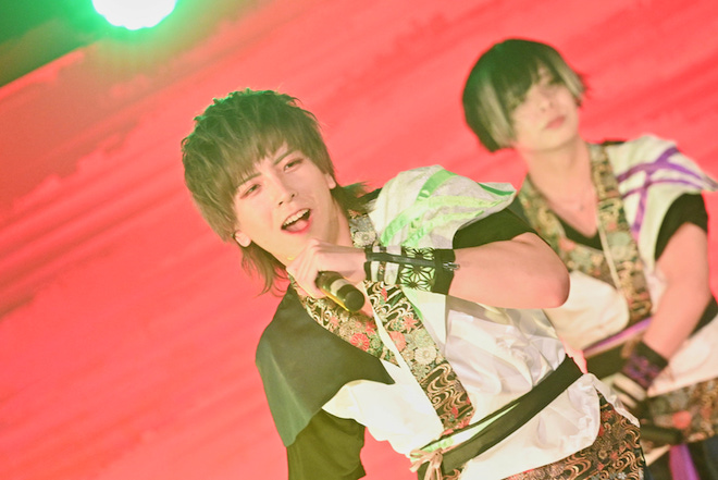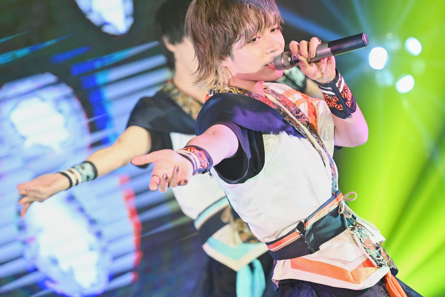 オープニングを飾ったのは、その名の通り春らしいポップなアップチューン「サクラMySweet!!」。「もっともっと来いよ!」と滝川陽彩(オレンジ担当)が呼びかけると、「おい! おい!」とかけ声を上げたり、メンバーの名を叫ぶ戦乙女【おとめ】(ファンの呼称)たち。咲き誇る桜のように、メンバーと戦乙女【おとめ】たちの笑顔が満開となった。そして、千葉ユウヤ(赤担当)の「三周年、楽しむ準備はできてるか?」という問いかけに、ファンは大きな喚声を上げると、「戦神神楽」「夢シンパシー」と2曲続けて披露された。