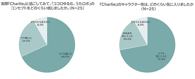 2020年12月から約3週間実施された「Charlie」のプロトタイプによるモニターアンケートでは、92.0%の人が「Charlie」の「ココロゆるむ、うたロボ」というコンセプトに共感したと回答。また、「Charlie」のキャラクター性についても92.0%もの人が気に入ったと回答したという。その他モニター体験者の声は以下のとおり。