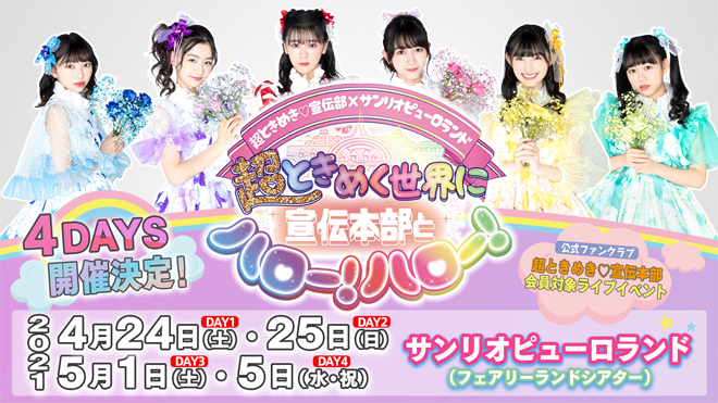 日程はすでに発表されていた4月24日と4月25日に、5月1日と5月5日を加えた4日間。<超ときめき♡宣伝部×サンリオピューロランド 「超ときめく世界に宣伝本部とハロー!ハロー!」>と題し、サンリオピューロランド内フェアリーランドシアターにて実施される。