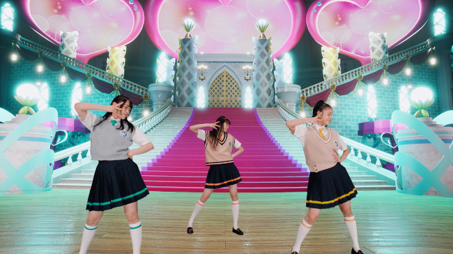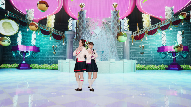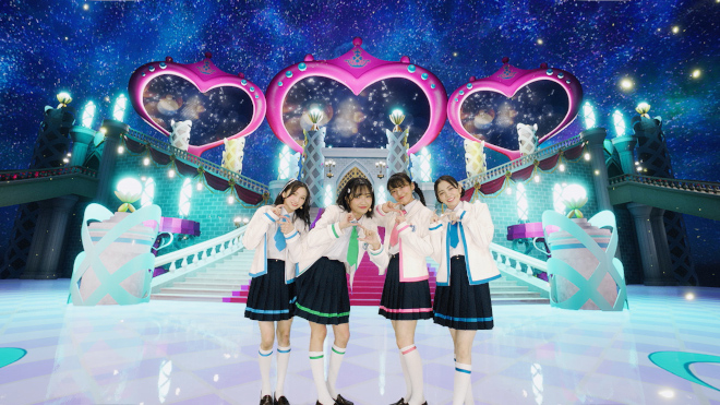 その後もCGによる満開の桜の下でeast²(ユズハ・ラン)が歌った「サクラ道!」や、たこ焼きなど大阪名物の演出がユニークだったwest²(モモカ・ミナミ)の「ワチャ×2」、海に浮かぶステージではsouth²(ミサキ・クレア・キラ)による「Never Give Up ~うつむかず顔を上へあげて~」など、アニメーションのストーリーと融合しながらメンバー自身が全力のパフォーマンスで盛り上げていく。