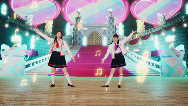 2日目は、アニメーションではなくリアルなパフォーマンスからスタート。まずはsouth²(ミサキ・ヨウカ・クレア・キラ)が「Shining You, Shining Me ~夢のチカラで~」を披露し、続くeast²(ユズハ・トア・ラン)は満開の桜のもとで「サクラ道!」~「セーノでGO!」~「オールOK!」~「ねっ!」を元気にメドレーで。west²(モモカ・ミナミ)も「ワチャ×2」~「愛×2」~「サ×3 サイコー」を息の合ったパフォーマンスで届けてくれた。ステージに再び現れたsouth²は「Never Give Up ~うつむかず顔を上へあげて~」、そして「ありがとう ~ひとことあなたに~」を丁寧にパフォーマンス。歌詞のひと言ひと言に思いを託すような表情も印象的だった。