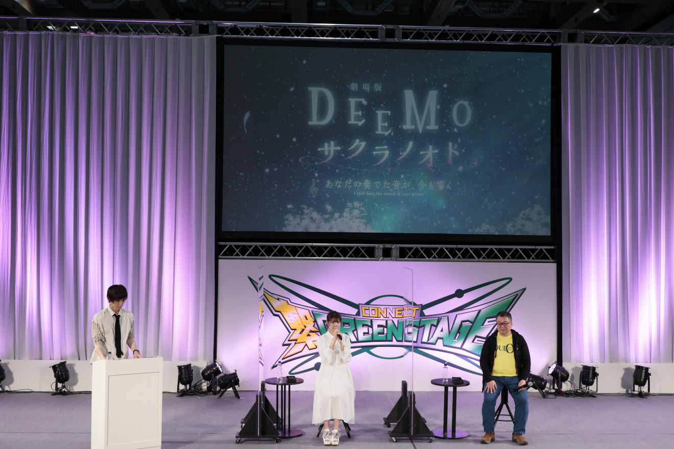 イベントの最後に「スタッフがほんとに頑張っている作品。より優しく、切ない音楽映画になりますので、完成まで後ちょっとです。」と作品の完成が迫っていることを語った藤咲総監督。そして、「ゲームの世界を一歩どころか二歩三歩飛び出して映画という形でDEEMOという作品に関わらせていただいてゲームのファンとしても本当に嬉しいです。原作ゲームのファンの皆さんにとっては数々の名曲がストーリーを彩っているのでそちらも楽しんで頂ける作品となっていると思います。まだまだ発表できないことがありますが楽しみに待っていて下さい。」と竹達彩奈。少しずつではあるが徐々に作品のピースが揃い始めた『DEEMO THE MOVIE』の劇場公開が待たれる。