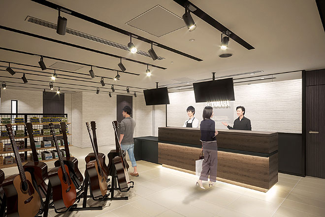 明るく居心地の良い空間に、ヤマハブランドのギターをはじめ、ドラム、シンセサイザー、音楽制作機器など豊富なラインアップを展示。グループブランドであるLine 6、Ampeg、Steinbergの製品も取り扱う。アコースティックドラムの試打室には、高い防音性能と快適な音響環境を実現するヤマハの防音室「アビテックス」を採用する。また、音楽制作機器やソフトウェアを取り揃えた専用スタジオでは、ヤマハのリモート合奏サービス「SYNCROOM」の体験も可能で、今後、セミナーやクリニックも開催予定。