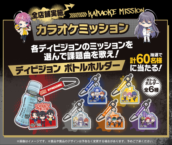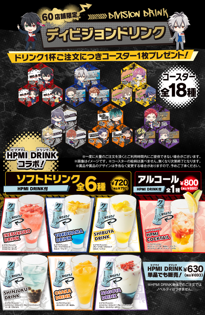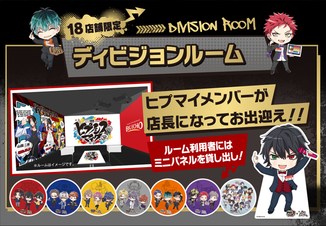 今回のキャンペーンでは、各ディビジョンをイメージした大迫力のディビジョンルーム(ビッグエコー18店舗限定)、ヒプノシスマイクが開発したドリンク「HPMI DRINK」とコラボしたスペシャルドリンク(ビッグエコー60店舗限定)が登場。ドリンク1杯の注文につき、ビッグエコー店長になったメンバー18名の描き起こしミニキャラをデザインした「ディビジョンコースター」1枚がランダムでプレゼントされる。