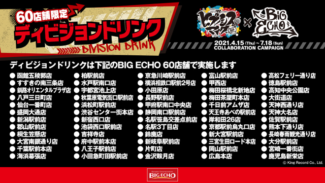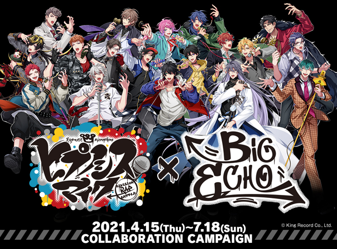 2回目のバトルシーズンが開幕し、更なる盛り上がりを見せている、音楽原作キャラクターラッププロジェクト「ヒプノシスマイク-Division Rap Battle-」とビッグエコーのコラボキャンペーンが、4月15日(木)〜7月18日(日)に実施される。