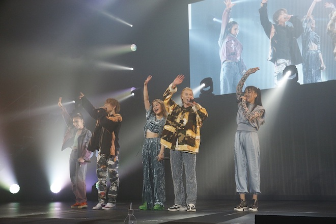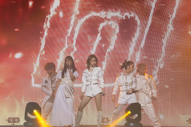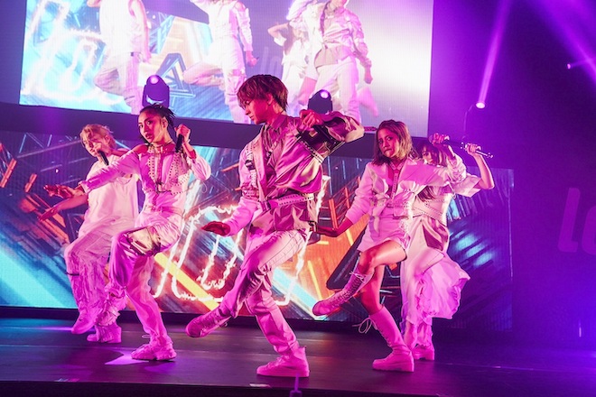 日本レコード大賞新人賞も受賞した彼らのデビュー曲「fire!」でライブがスタート。「ladi dadi」「spank!!」とデビュー作から順にシングル楽曲が続き、lol-エルオーエル-の魅力のひとつでのあるダンスを堪能できるステージに、会場のボルテージは一気にあがった。前半は懐かしいナンバーでのメドレーも披露。