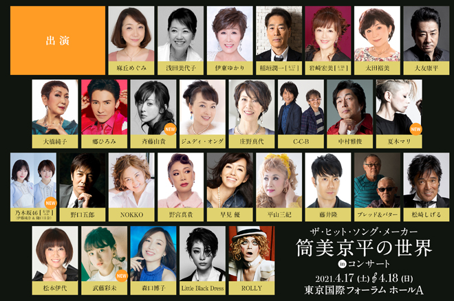 2021年4月17日(土)、18日(日)に東京国際フォーラム ホールAにて開催される<~筒美京平 オフィシャル・トリビュート・プロジェクト~ ザ・ヒット・ソング・メーカー 筒美京平の世界 in コンサート>の追加出演者発表が行われ、全出演者が決定した。