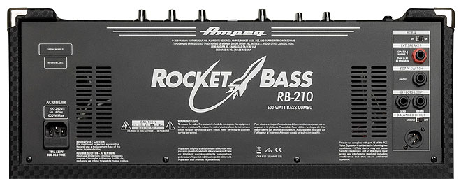 ▲リアパネルには外部スピーカー出力(RB-115以上)、SGTフットスイッチ入力(RB-112以上)、エフェクトループ(RB-112以上)、XLR DI出力(RB-110以上)を配置。写真はRB-210。