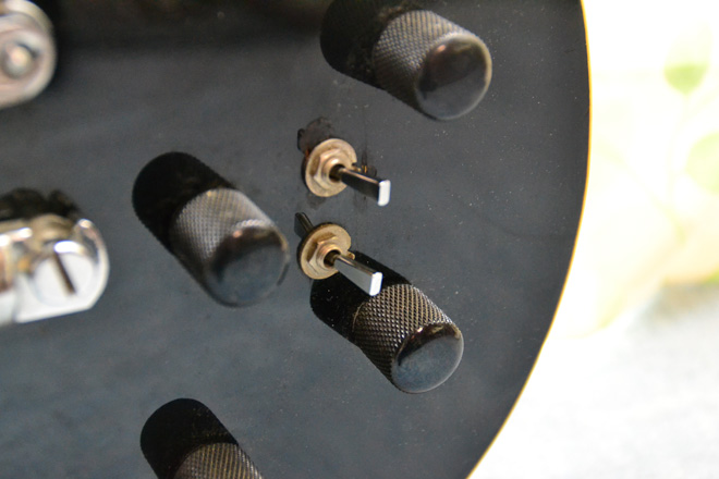 それで自分でボディに穴をあけてスイッチを取り付けたのだが、表面の塗装を割ってしまい、黒マジックペンでごまかすという情けないことになっている。が、たいして目立たないので、ま、これでいいかと。