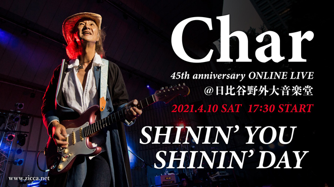 2021年春、本来であれば45周年記念の全国ツアーを予定していたものの、多くの公演が新型コロナウイルス感染症の影響でキャンセルとなってしまった。Charとしてはせめて自身が十代の頃から育った聖地・日比谷野外大音楽堂でのライブだけは行い、音楽を届けたいという強い思いがあり、ルーツである1976年のデビューシングルB面楽曲 『SHININ’ YOU SHININ’ DAY』と銘打ったライブを全国のファンに向けて配信することに。Gt/VoにChar、Ba 澤田浩史、Key 小島良喜、Dr ZAX(The BONEZ/Pay money To my Pain)の鉄壁なバンド布陣で行われるライブは必見だ。
