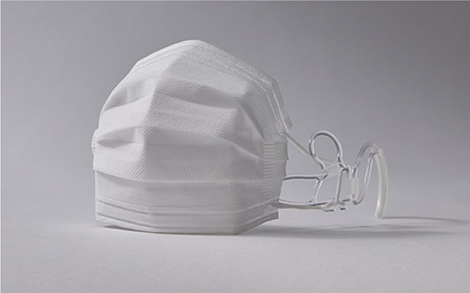 ▲「ヴォーカルセーフティガード」は、フレームに市販のマスクを取り付けて使用する。好きなマスクを選べるのもポイント。写真はマスクを取り付けた状態。