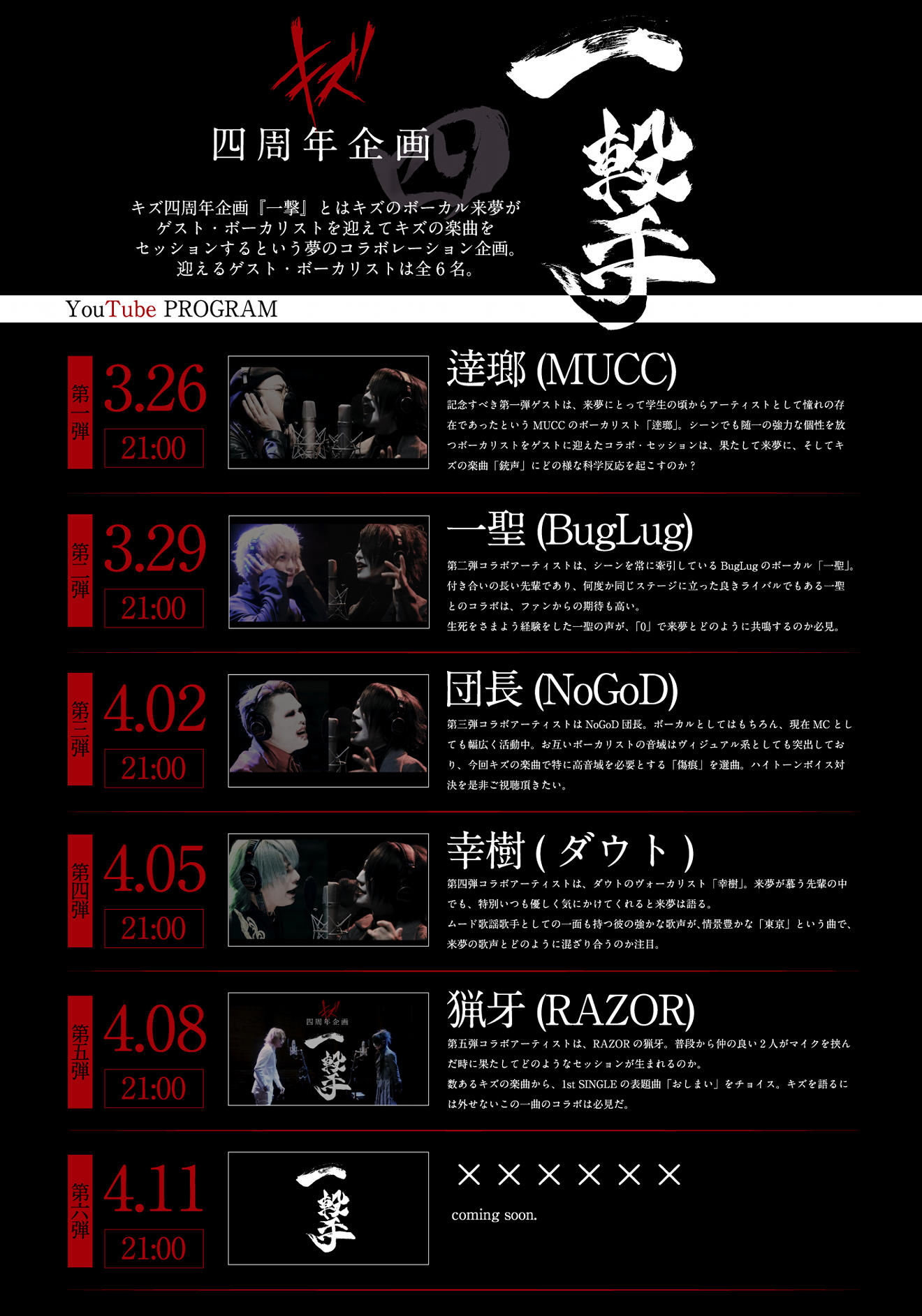 『一撃』はキズのボーカル・来夢がゲスト・ボーカリストを迎えてキズの楽曲をセッションするというコラボレーション企画で、全6名のゲスト・ボーカリストが登場する。