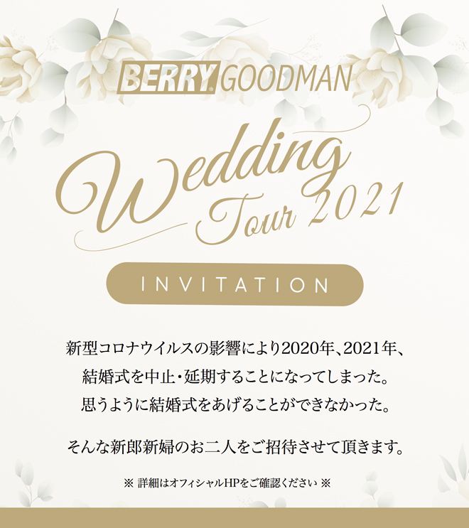 また、4月よりスタートする結婚式場ツアー<ベリーグッドマンへの道 WEDDING TOUR 2021~それ以外のライブなんてありえま編~>の各公演に、新郎新婦を1組ずつ招待することも発表された。新型コロナウイルス感染症の影響により結婚式が中止・延期になったり、規模を縮小したカップルが対象となる。応募方法の詳細はベリーグッドマンのオフィシャルサイトで確認しよう。