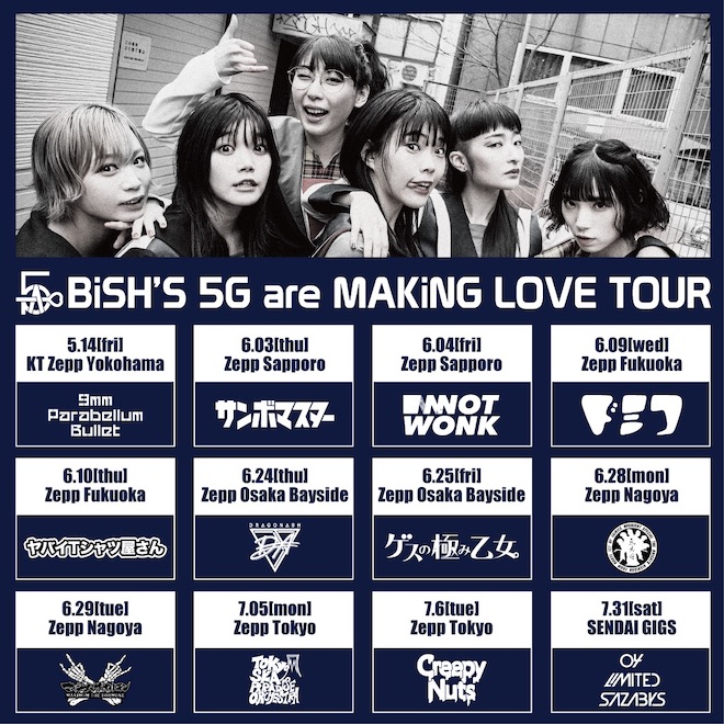 <BiSH’S 5G are MAKiNG LOVE TOUR>は、2ヶ月半かけ全国7箇所12公演にて開催される。セントチヒロ・チッチが「やべーメンツ」と豪語した今回の対バンアーティストの中には、初の対バンとなるアーティストも名を連ねている。