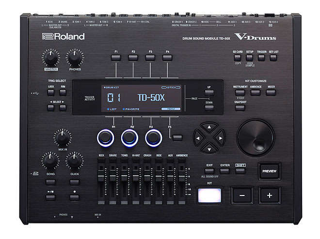 ▲新音源「TD-50X」は、ステレオXLR出力と8系統のTRS標準タイプ出力を備え、PA機器へバランス接続が可能。ライブ・ステージでの使用にも便利。USBオーディオ/MIDIは32チャンネルの出力に対応し、PCでの音楽制作に活躍する。