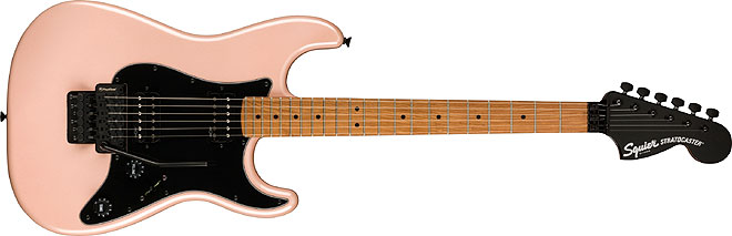心臓部であるSquier SQR Atomic Humbuckingピックアップは、ピックアップセレクターが2と4のポジションの時にコイルタップすることが可能で、より多彩なシングルコイルトーンも得られる。その他、ロックサウンドに欠かせないスムーズなベンディングが可能なFloyd Roseのダブルロッキングトレモロ、滑らかなチューニングと弦交換が容易なスプリットシャフト付シールドギアのチューニングマシンなどを搭載。カラーはShell Pink PearlとGunmetal Metallicの2種を用意。