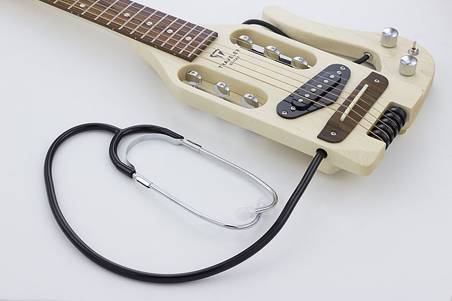 コントロールは各ピックアップのボリュームとピックアップ・セレクター・スイッチを搭載。スケールは24-3/4インチ、22フレットで、ミニギターとは異なり、違和感なく演奏が楽しめる。