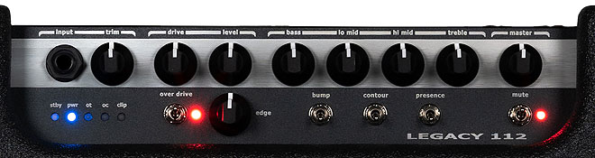 ▲トップ面のコントロールパネル。2つのチャンネル(Normal, Overdrive)、4バンドのアクティブEQ(Bass、Lo-Mid、Hi-Mid、Treble)、3つのボイシング・フィルター(Bump、Contour、Presence)で多彩なサウンド・メイキングが可能。写真はLegacy 210。