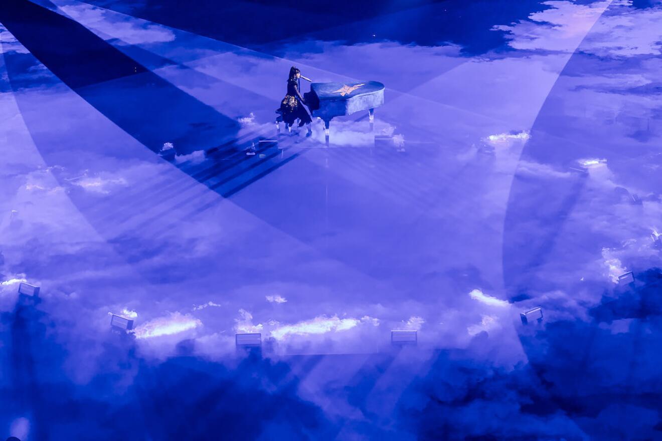 その後、雲海が広がったステージ中央にストリングスとピアノの美しい響きとともにSU-METALが現れ、「NO RAIN, NO RAINBOW」を凛とした佇まいと真っ直ぐな歌声で歌い、さらにパフォーマンスに輪を掛けるピアノの演出も加わり会場を感動の渦に巻き込んだ。