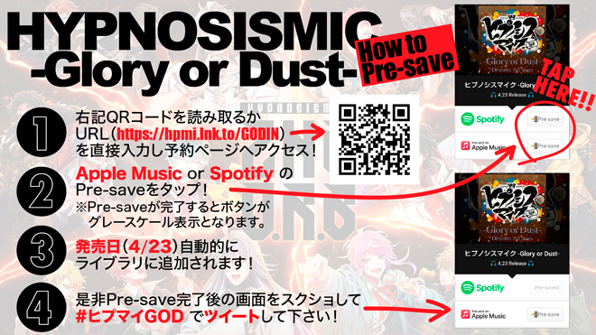 なお、本ミュージックビデオはヒプノシスマイク公式ファンクラブ「HYPSTER」では4月22日0時に、公式YouTubeチャンネルでは4月23日0時にプレミア公開される。さらに、4月23日0時に各種音楽配信サイトで「ヒプノシスマイク-Glory or Dust-」がリリースされることも明らかになった。