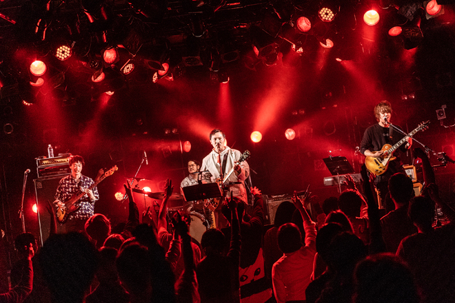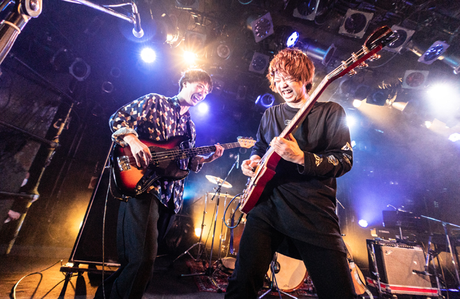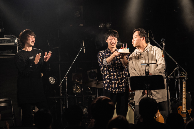 ライブ終盤、アンコールでサプライズのバースデーケーキを持って現れたのは、シークレットゲストの空想委員会のメンバー、佐々木直也(G)と岡田典之(B)。騒然となった会場で、サポートにゲストドラマー有田清幸(CIVILIAN)を迎えた3人は、空想委員会のナンバー「完全犯罪彼女」「純愛、故に性悪説」「マフラー少女」とファンの中でも支持の高い楽曲3曲を披露。短いながらも久しぶりの3人の演奏をハイテンションで楽しんでいるメンバーの笑顔が、印象的であった。