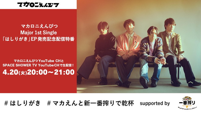 4月21日(水)にメジャー1stシングル「はしりがき」EPをリリースするマカロニえんぴつ。『「はしりがき」EP発売記念特番』と題した生配信では、マカロニえんぴつによる「はしりがき」EP全楽曲解説や、アコースティックライブなど様々なプログラムが予定されている。