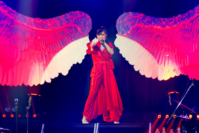 定刻になると客席の照明が落ち、ステージ上段にスポットライトに照らされたAKINOが登場した。AKINOは舞台に作られた大きな翼のオブジェと重なって、まるで空から舞い降りた天使のように見える。いよいよ15周年記念ライブが始まる。今回のライブのために結成されたガールズバンドが演奏をスタートさせると、場内に大きな拍手が起こった。