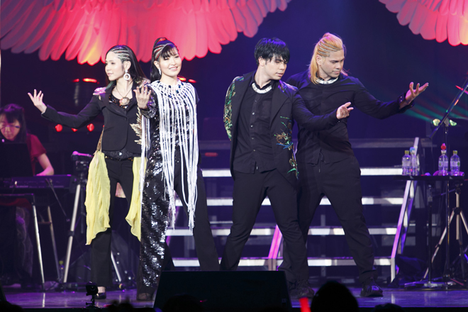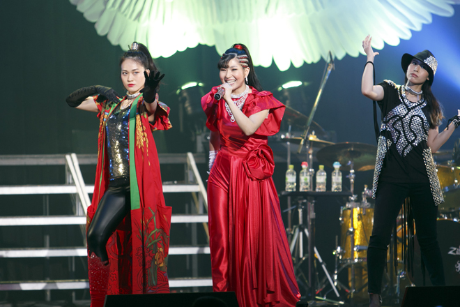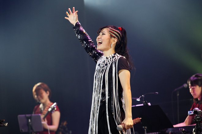 そして流れるように次の曲へ。ステージにAKASHIとKANASAが合流して「Go Tight!」、9曲目「Golden Life」を熱唱。バラードで落ち着いた場内の空気を吹き飛ばす激しいパフォーマンスを行った。ヒット曲を惜しげもなく投入してくるセットリストは、これぞ15周年記念ライブにふさわしい内容。AKINOはもちろん、メンバーやバックバンド、ダンサー、観客など、場内にいるすべての人間が思う存分楽しんでいるのがよくわかる。