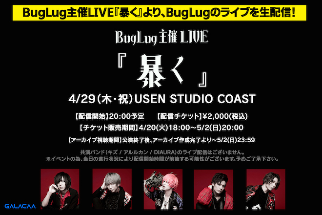 <暴く>には、BugLugのほか、DIAURA、アルルカン、キズが出演。すでに現地チケットはソールドアウトしている。配信はBugLugのライブ部分のみ、ライブ終了後3日間はアーカイブ視聴可能となっている。