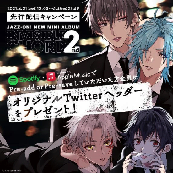 「Invisible Chord 2nd」は、1月にリリースされた「Invisible Chord 1st」を異なるアレンジで異なるキャラクターが歌った楽曲。先行配信のスタートを記念して、Apple MusicとSpotifyでミニアルバム『Invisible Chord 2nd』をPre-add/Pre-saveするとオリジナルTwitterヘッダーがもらえるキャンペーンも4月21日正午より実施される。