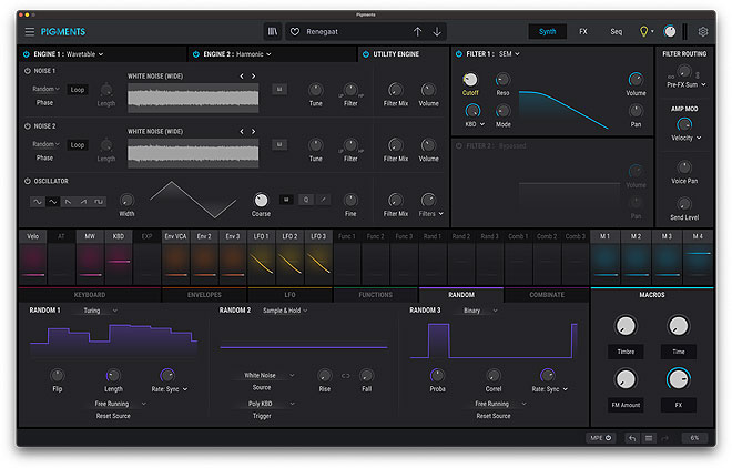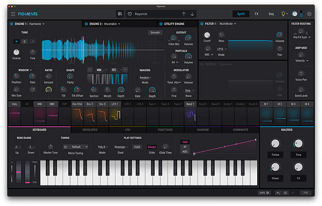 ウェーブテーブル、バーチャルアナログ、サンプル&グラニュラーの3タイプのシンセシス方式に加え、新たにPigments 3で追加されたのは、表現力に優れ、美しいサウンドのアディティブ(倍音加算)シンセシスのハーモニック・オシレーター。プラスティック管の共鳴音から、刻々と変化する声のようなサウンドまで、さまざまな音色をビビッドに作り出すことができる。この4タイプから2タイプを組み合わせて自在な音作りが可能だ。また、サウンドに深みをプラスできるユーティリティエンジンも搭載。エクストラオシレーターと最大2レイヤーのサンプルベースのノイズを使用可能だ。