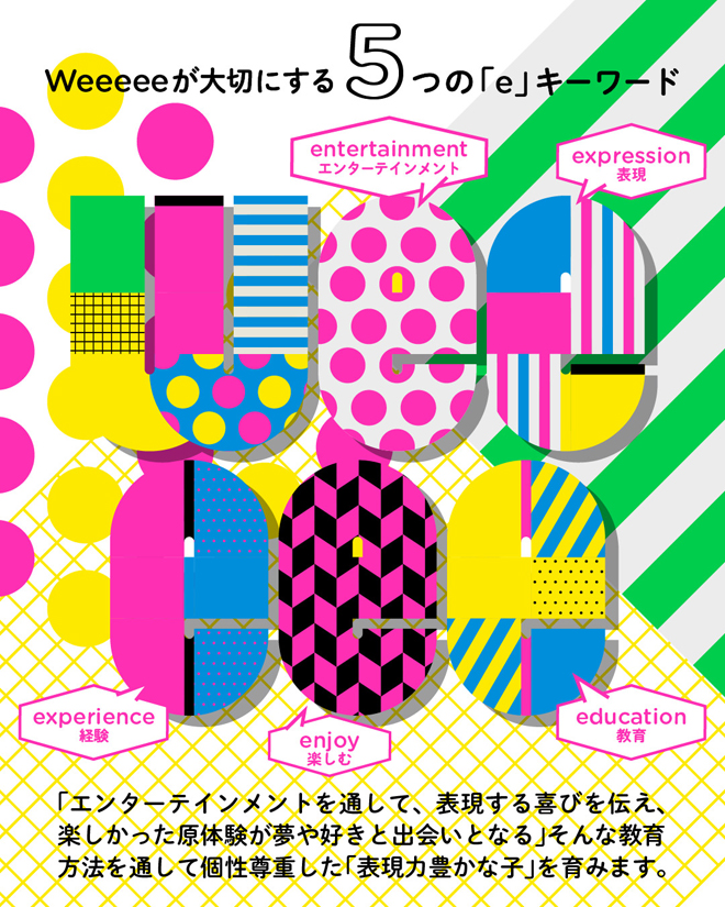 Weeeeeは、education(教育) × entertainment(エンターテインメント) = edutainment(エデュテインメント)を基本理念に、音楽やダンスにアート、さらにスポーツなどの体験型イベントやマルチメディアを通して、楽しみながら“教育として機能するエンターテインメント”を発信していく。こどもたちの夢につながる「やりたい!なりたい!」との出会いを産みエンターテインメントの力で、たくさんのこどもたちを夢中にさせていく予定だ。表現する喜びを知り、夢を形にした大人たちが “次の夢に繋げていく架け橋”となるエデュケーション・プログラムになっている。