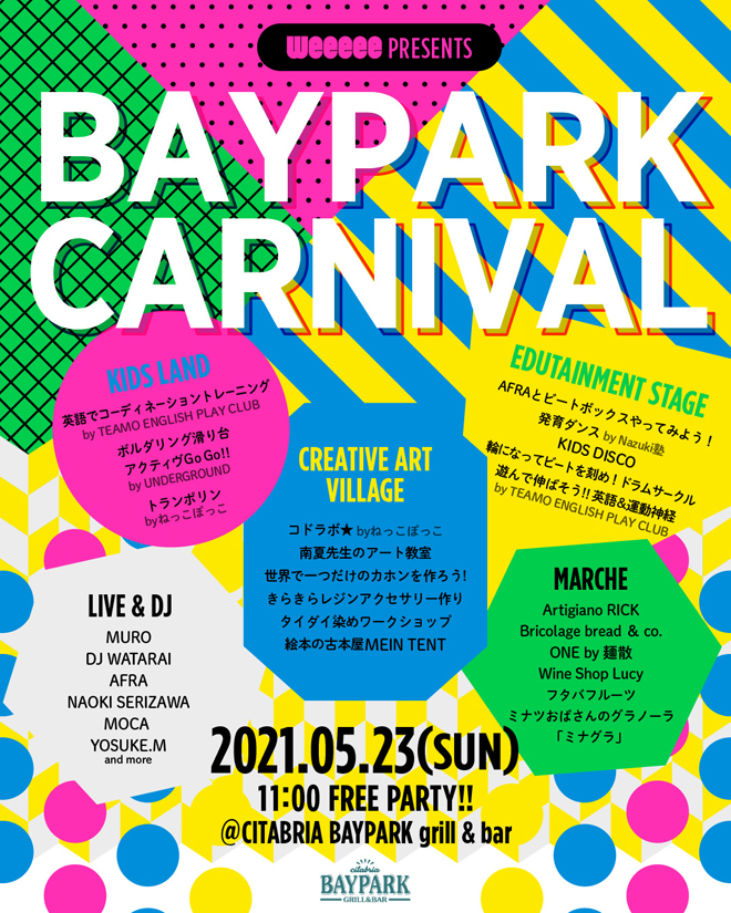 またWeeeeeのローンチパーティ<BAYPARK CARNIVAL>が2021年5月23日(日)に新豊洲の運河沿いの野外レストラン「CITABRIA BAYPARK grill & bar」にて開催。 エンターテインメント×エデュケーションをテーマにした、音楽やダンス、アートなどの様々な体験型コンテンツのほか、身体を思いっきり動かせるアトラクションやワークショップがプログラムされた、こどもも大人も楽しめるパーティだ。エデュテイメント・ステージでは、ダンスを通して五感を刺激して脳を活性化するNazuki塾による「発育ダンス」の無料レッスンや、ドイツで生まれた運動神経を伸ばす「コーディネーショントレーニング」のメソットに基づいた、遊びながら英語と運動神経を伸ばすTEAMO ENGLISH PLAY CLUBの体験トレーニング。さらに日本のヒューマンビートボックスの第一人者AFRAによるビートボックス講座やプロのパーカッショニストと一緒にカホンを叩くドラムサークルなど、遊びながら学ぶエデュテイメント・プログラムが盛りだくさん。