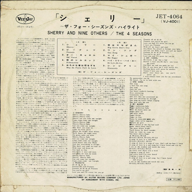 そんなフランキーのザ・フォー・シーズンズ を僕は1960年代初頭からFENでガンガン楽しんでいた。彼らのシングル「恋のハリキリ・ボーイ」(B面『ピーナッツ』も傑作)、そして25センチ(10インチ)LP『シェリー』を購入したのが63年頃だった、未だ中学生だったのでなかなか30センチ(12インチ)のLPには手が出なかった。
