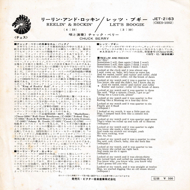 “アルバム紹介”で登場したチャック・ベリー、彼のライナーノーツ何度か担当させてもらった。1972年ロックンロールがリバイバルしている中で御大は『The London Chuck Berry Sessions』で注目され、ここからのシングル・カット、タイトルからしてニヤリとさせられる「My Ding-A-Ling」が久しぶりにチャートを駆け巡った。Billboard 誌HOT100で10月21日付&28日付の2週第1位に輝いた。チャック初のポップ・チャート/ナンバー・ワン・ソング、ゴールド・レコードにも輝いたのだった。ロンドンからのセカンド・シングル・カットが「Reelin’ & Rockin’」。この日本盤シングルのライナーを書いた。