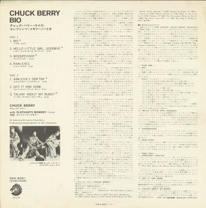 このライナーも書かせていただいた。ここでの注目は何と言ってもタイトル・ソングでA面1曲目の「Bio」。ブルース・タッチな展開の中でチャックがデビューから有名になるまでを歌っている。ライナーの中で当時僕はこんな訳を記している。