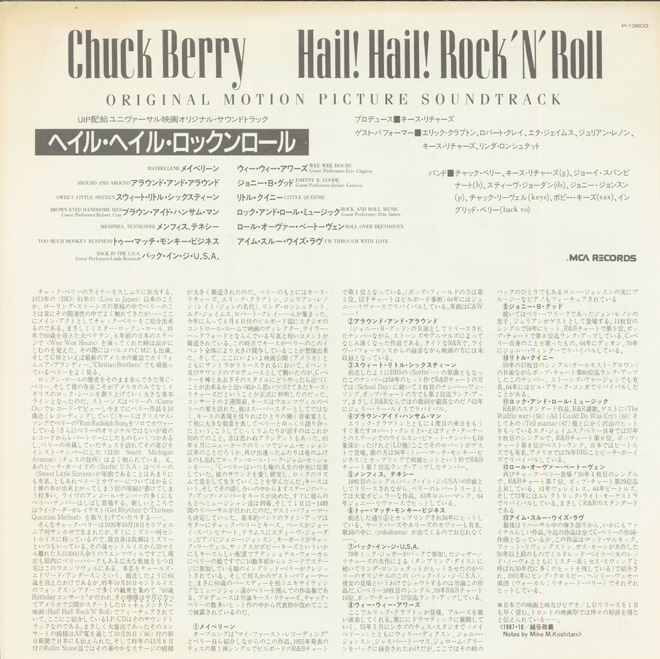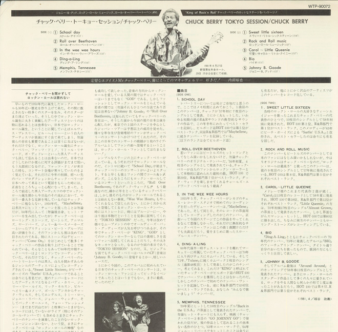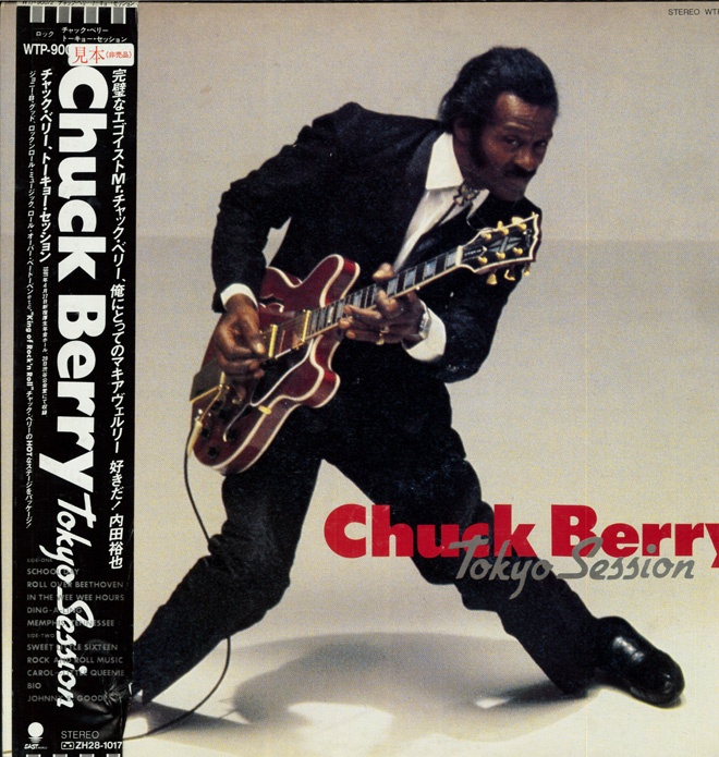 チャック・ベリーは1981年初来日公演(招聘は今でも友人の林博道&一瀬啓永)。娘イングリッドがコーラスで同伴。ピアノはこれまた仲良しだった故・成毛滋が務めた。そして僕には全然怖くなかった(笑)故・内田裕也がMCだった。東京3公演のうち4月27日@新宿厚生年金ホール(LPクレジットのまま)&29日@渋谷公会堂のステージの模様が故・石坂敬一のプロデュースでレコーディングされアルバム『Tokyo Session』としてリリースされた。ライナーは敬一さんの依頼で僕が担当。OBIの裕也さんのメッセージ“完璧なエゴイストMr.チャック・ベリー、俺にとってのマキアブェルリー 好きだ!”にも感激させられた。この来日時にはPARCOのコマーシャル撮影もされた。チャックはその際、ある程度撮影が進んだところで「これで終了」「もっと撮りたければこれからはワン・シャッター◯ドル」。後日、敬一さんとの酒タイム時に聞かされたエピソードだ。
