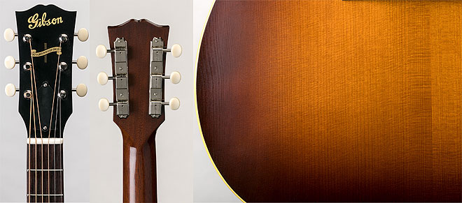 ルックスで目を惹くのが、奥田民生のJ-45を彷彿とさせるヴィンテージの質感溢れる極薄ラッカー・フィニッシュの“ウォッシュト・ヴィンテージ・サンバースト”。さらにヘッドストックには戦時期特有の“スクリプト&バナー”ロゴが採用され、サウンドホール周りの7層のパーフリング含め45年製J-45ならではの特徴を再現している。