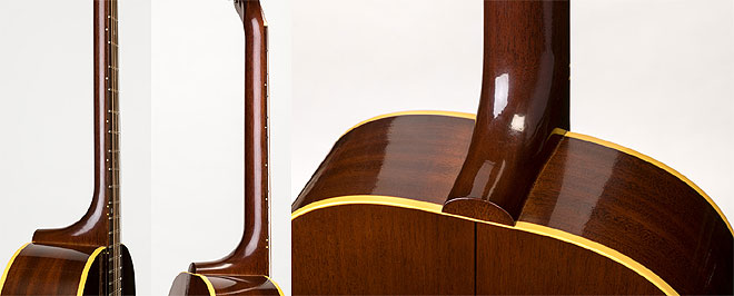 ▲極太のネック・プロファイル、ジョイント部分のボディ厚は1942年登場のJ-45の特徴を再現したもの。バインディングも当時にならいシングルバインディングとしている。