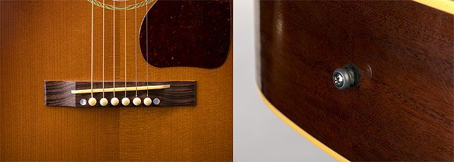 5. ボディサイド・バックはマホガニー材を採用し、ジョイント部分のボディ厚について45年製J-45同様の厚みを持たせ、よりフラットなボディバックのデザインを採用
