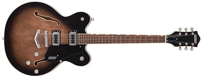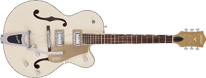 プレミアムな仕様として、最高の演奏性を実現した2.5インチ(63.5ミリ)厚の薄いボディ、パーロイドのネオクラシックサムネイルインレイを備えた12インチラジアスのローズウッド指板を使用。パーロイドの貼られたカバーを備えた2基のBlack Top Filter’Tron PUをマウントし、トレブルブリード回路搭載のマスターボリューム、マスタートーン、リア&フロントピックアップ用のボリュームコントロールノブと3ウェイPUスイッチによって、多彩な音色調整が可能。バインディングが施された特大のFホール、50年代後半のG6120ヘッドストック・デザインを採用。Graph Tech NuBoneナット、ローズウッド固定台座のアジャスタブルブリッジ、ビグスビーB60ビブラートテールピースを装備している。