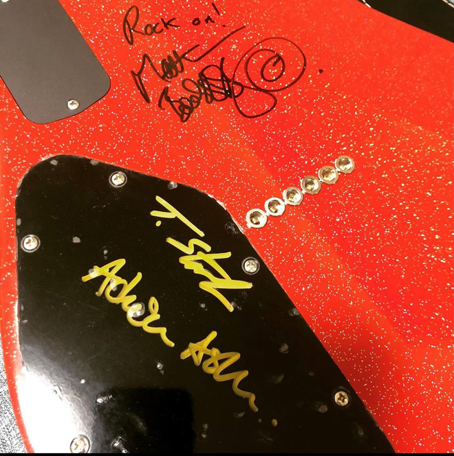 背面にマシュー本人のサインと、2019年のMuseのUKツアーで渡英時に、Manson Guitar Worksに招待いただき、バックパネルに社長のエイドリアン、マシューのギター製造を務めるティムからもサインをいただきました。