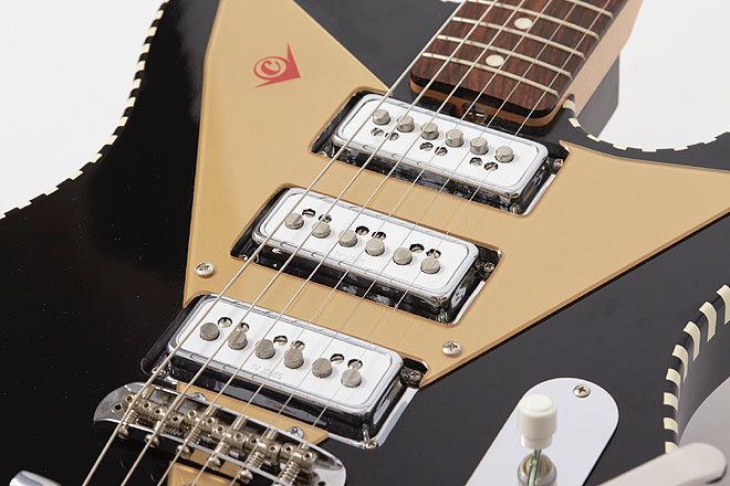 ▲フラッグシップモデルのV1 Blackはトリプルピックアップ仕様。V字型のピックガード、ボディの縁にめぐらされたツートーンカラーのチェッカードステッチが個性的。