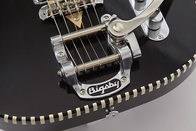 ▲V1 Black(写真)とセミアコタイプのSicily Blackは、ビグスビーのビブラートアームを搭載。