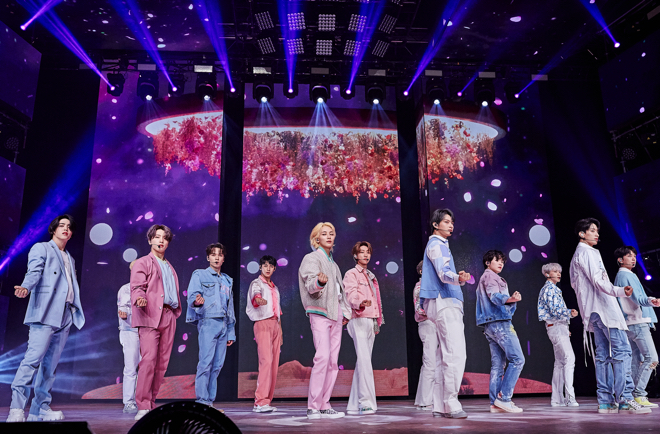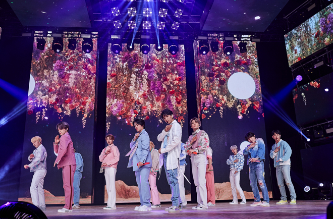 後半はライブをたっぷりと。新曲「ひとりじゃない」では、ボタニカルな背景をバックに、パステルカラーの衣装で爽やかな魅力が全開。メンバーが数人でひとりのメンバーをリフトし、まるで空を飛んでいるかのように見える振付けや軽やかなステップにため息が漏れた。最後の曲は「舞い落ちる花びら (Fallin’ Flower)」。儚げな美しさで幻想的に幕を閉じると、アンコールでは「Smile Flower」の日本語バージョンを。花をテーマにしたこの2曲の披露の合間には、花びらが散ったあとに四季が移り変わって再び花を咲かせるまでの様子が映像とメンバーのリレー朗読で表現され、SEVENTEENがCARATと会える晴れの日がまた訪れる希望を感じさせていた。