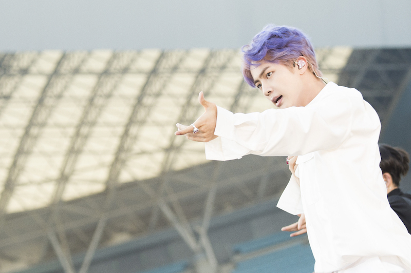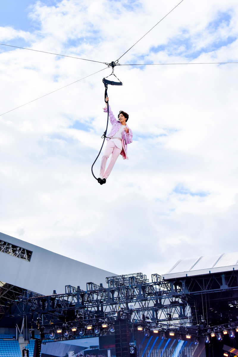 JUNG KOOKはワイヤーを使ってアリーナ席の上空を舞いながら「Euphoria」を披露。彼の柔らかい歌声を、透き通るような青空にまで響き渡らせていた。