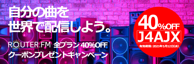 「TikTok」と「resso」への楽曲データ提供開始を記念して、「ROUTER.FM」で利用できる全プラン40%OFFクーポンコードのプレゼントを実施。配信登録決済時にクーポンコード「J4AJX」を入力すれば、割引価格で楽曲を登録できる。クーポンコードの適用期間は2021年4月28日(水)〜2021年5月12日(水)まで。この機会をお見逃しなく。