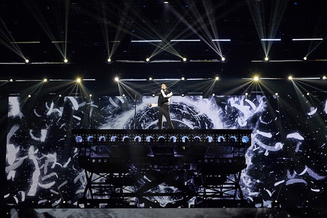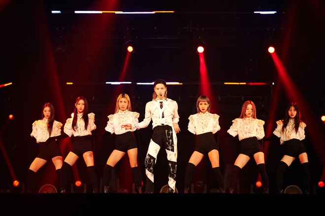 「Guess Who + Sexuality」では降り注ぐレーザー光線を跳ね返すような攻撃的パフォーマンスを披露、両腕を縛ってのダンスをみせた「Criminal」では紐を解いて眼帯を取り、徐々に開放されていく世界観をよりドラマティックに表現した。ダンサーを従えての力強いフォーメーションダンスから、手を広げて天を仰ぐ動作まで、「IDEA:理想」は一分の隙も見せない。