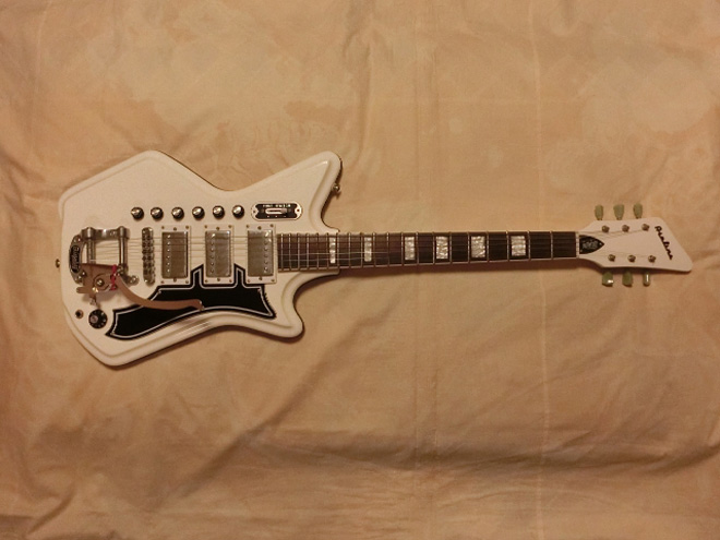イーストウッドのエアラインの改造です。軽いギターが欲しいなと思って、それでもビグスビー付にしました。センターPUは逆位相に配線変え。いろんな音色が出る様になりました。